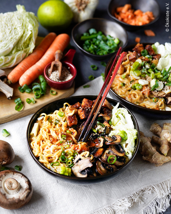 3. Servieren: Die fertige Nudelsuppe in Schalen füllen und mit dem knusprig gebratenen Tofu, den Pilzen und dem Chinakohl anrichten, gebratene Lauchzwiebeln darüber geben. Nach Belieben mit Erdnüssen oder Sesam bestreuen und servieren.