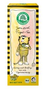 Würzig und kräftig - wie eine Tigerumarmung. Dieser Bio-Kräuter-Früchtetee macht ruckzuck putzmunter. Mit Rooibos und Zitronengras. Der Kleine Tiger steht morgens auf und kocht eine Tasse für seinen Freund den Kleinen Bären und eine für sich selbst.