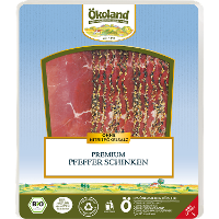 Über 4 Monate im handwerklichen Naturreifeverfahren ohne Nitritpökelsalz gereift und mit Pfeffer gewürzt, entwickelt der Ökoland Premium Pfefferschinken seinen unverfälschten und pikanten Geschmack. Nur bester Schweineschinken wird hierfür verarbeitet, alles unter strengen Qualitätskontrollen. Bioland-zertifiziert. Ohne Nitritpökelsalz und andere Zusatzstoffe hergestellt. Von Natur aus glutenfrei, laktosefrei, natürliche Hefenbildung durch Fermentation. Innovative Verpackung aus Polypropylen (PP) bewirkt hohe Recyclebarkeit für die Kreislaufwirtschaft von Verpackungsmaterialien.