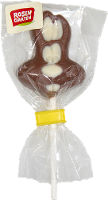 Lolly in lustiger Osterhasen-Form aus zart-schmelzende Vollmilch-Schokolade - mit weißer Schokolade geschminkt