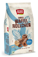 Knusprige Dinkel-Waffelröllchen, umhüllt von zartschmelzender Vollmilchschokolade.