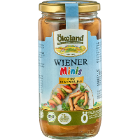 Ökoland Wiener Minis sind aus hochwertigem Bio-Schweinefleisch und geschmackvollen Bio-Gewürzen hergestellt und eignen sich besonders als Einlage in Gemüse-Eintöpfen oder als Partywürstchen für Spieße und kleine Snacks.  Der natürliche Buchenholzrauch gibt den Würstchen eine herzhafte Note. Hochwertiges Bio-Fleisch bedeutet, dass unsere Bio-Bauern konsequent für eine artgerechte Haltung und gesunde Fütterung der Tiere sorgen.Die Verarbeitung des hochwertigen Bio-Fleisches und der geschmackvollen Bio-Gewürze erfolgt nach strengen Qualitätsrichtlinien.