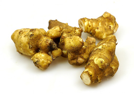 Die Knollen der Topinambur pflanze sind in Ihrer Größe mit kleineren Kartoffeln vergleichbar ähneln ansonsten aber eher der Ingwerknolle.